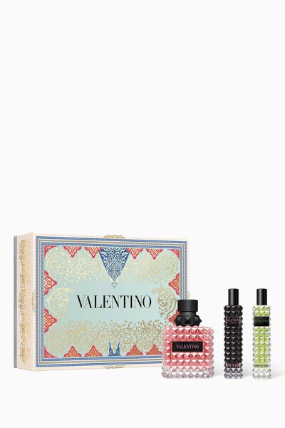 The Born In Roma Donna Eau De Parfum Set by Valentino is a celebration of individuality and self-expression. This luxurious trio includes the vibrant Born in Roma Donna Green Stravaganza Eau de Parfum travel size, the iconic Born in Roma Donna Eau de Parfum, and the bold Born in Roma Donna Intense Eau de Parfum travel size. Each fragrance offers a unique take on modern femininity, blending opulent florals with rich, sensual notes for an unforgettable scent experience.