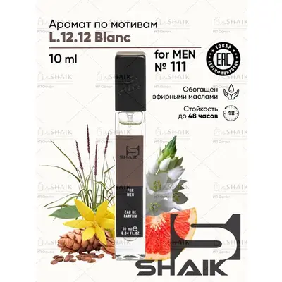 SHAIK - сертифицированная номерная парфюмерия. Ароматы SHAIK относятся к духам и обогащены эфирными маслами, благодаря чему имеют стойкость до 48 часов. SHAIK 111 - легкий и в то же время респектабельный аромат. Идеально подходит мужчинам, предпочитающим активный образ жизни. Верхние ноты раскрываются глубоким ароматом розмарина, пряного кардамона, окутанными свежестью грейпфрута. В сердце аромата нотки роскошного иланг-иланга и таинственной туберозы. В шлейфе представительный аромат хвойного кедра из Вирджинии, нежной кожи, замши и тонкая нить свежести ветивера. Верхние ноты: Кардамон, Розмарин, Грейпфрут. Ноты сердца: Иланг-иланг, Тубероза. Базовые ноты: Кедр из Верджинии, Кожа, Замша, Ветивер. Вдохновлены Шейк 111 Blanc 12 Бланк Духи начинают проявлять себя в полном объеме только после соприкосновения с химическим составом кожи. После нанесения парфюма на кожу мы слышим верхние ноты пирамиды, которые создают первое впечатление о композиции, вскоре с ними проявляются и смешиваются ноты сердца, раскрывая основной характер духов, позже в игру вступают основные ноты базы, которые определяют сущность всей парфюмерной композиции и придают глубокие оттенки аромату. Масляный парфюм для мужчин и женщин лучше всего наносить на чистую увлажненную кожу после душа, при этом не растирая композицию, для более продолжительного шлейфа духи рекомендуется наносить на самые горячие точки тела и в область волос (прически). Духи начинают проявлять себя в полном объеме только после соприкосновения с химическим составом кожи. После нанесения парфюма на кожу мы слышим верхние ноты пирамиды, которые создают первое впечатление о композиции, вскоре с ними проявляются и смешиваются ноты сердца, раскрывая основной характер духов, позже в игру вступают основные ноты базы, которые определяют сущность всей парфюмерной композиции и придают глубокие оттенки аромату. Масляный парфюм для мужчин и женщин лучше всего наносить на чистую увлажненную кожу после душа, при этом не растирая композицию, для более продолжительного шлейфа духи рекомендуется наносить на самые горячие точки тела и в область волос (прически). Обращаем внимание, что для каждого отдельного человека, на раскрытие аромата и его стойкость влияют не только составляющие пирамиды парфюма и уникальные особенности кожи (химический состав), но и многие другие факторы окружающей среды (температура, влажность). Турецкие масляные духи могут оставлять следы на одежде, так как парфюмированный спрей для тела и парфюмерная вода содержат в составе эфирные масла. Храните духи в темном месте, подальше от источников тепла.